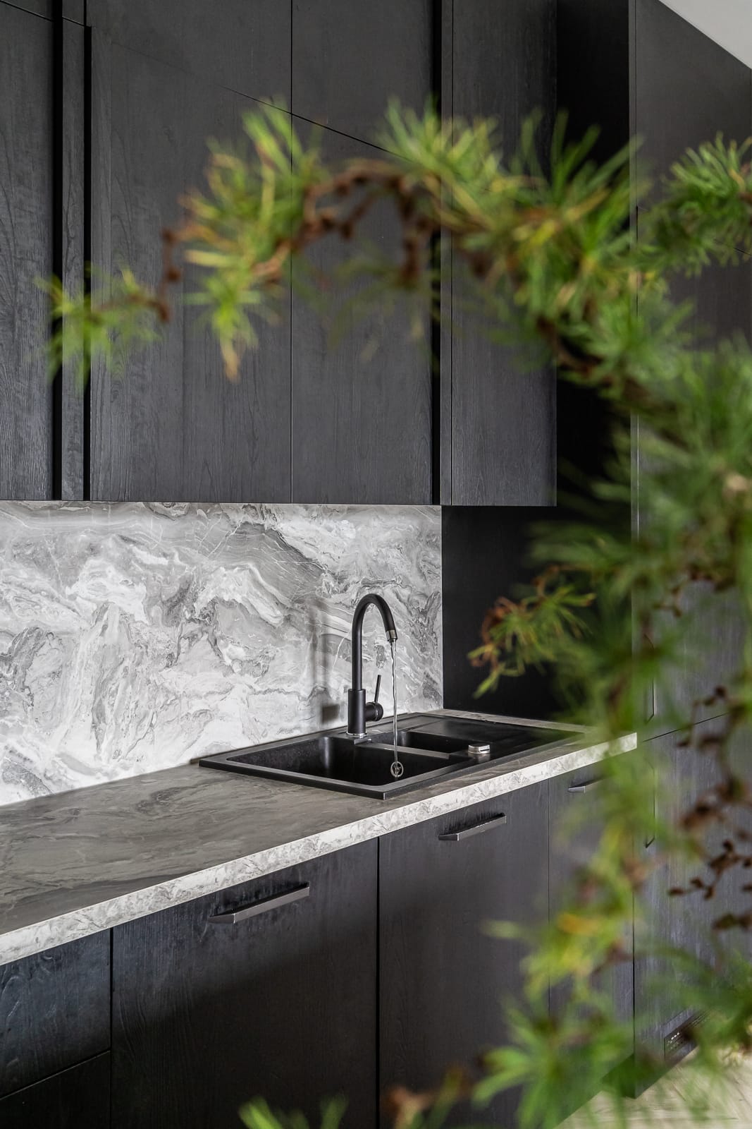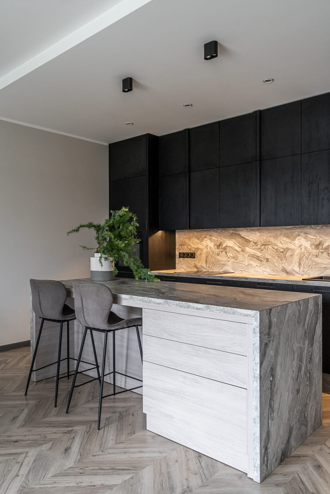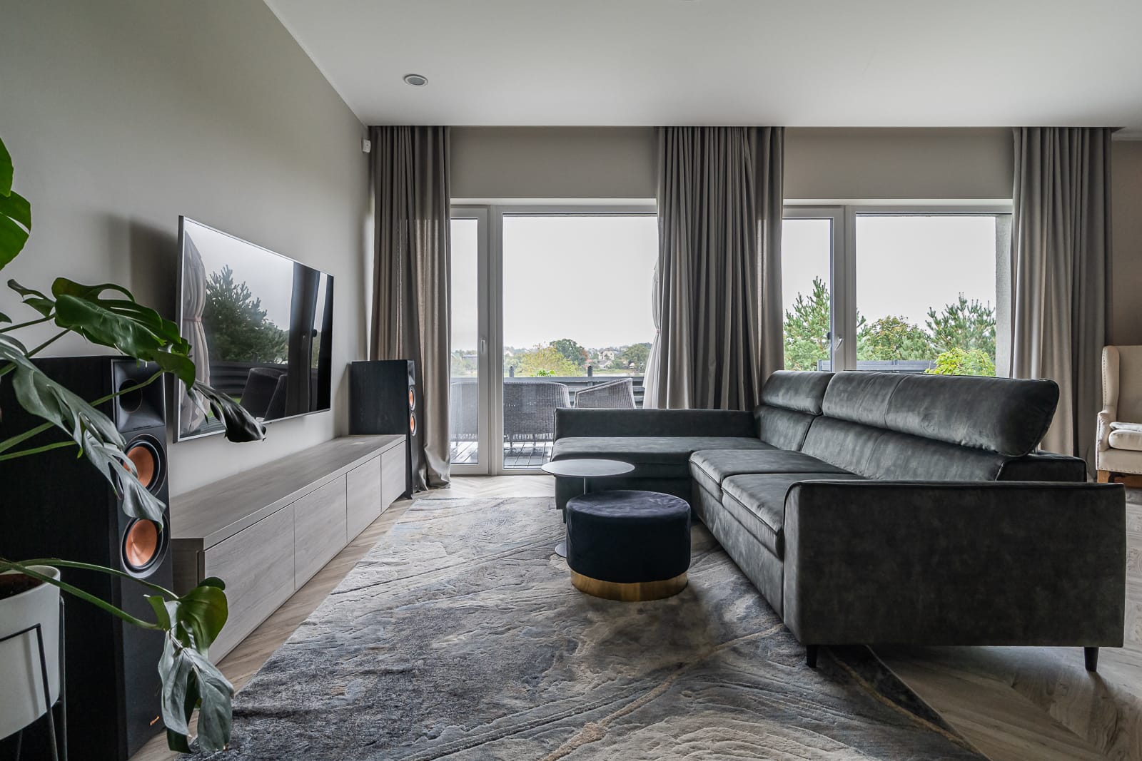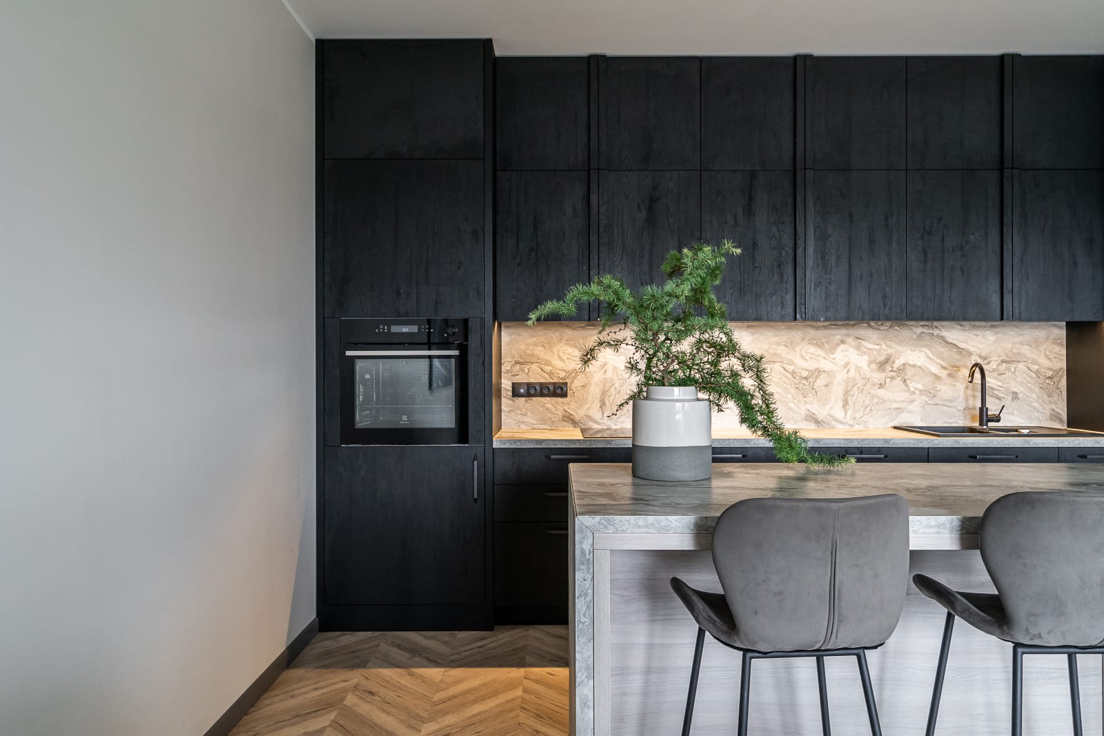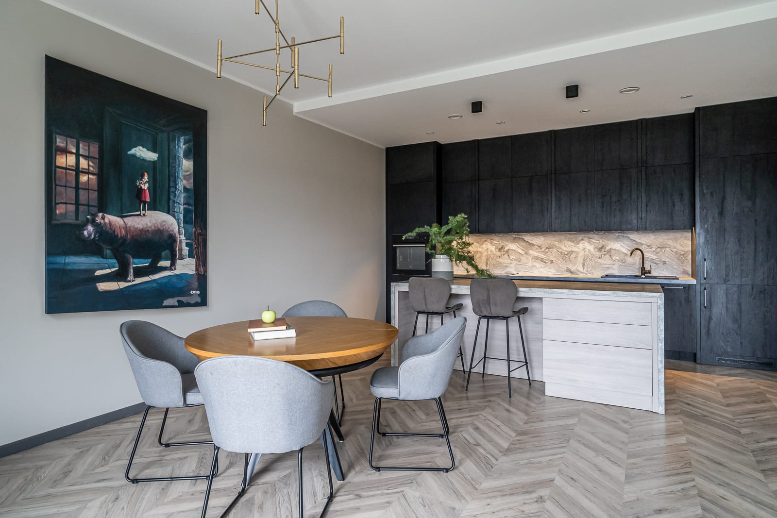 Virtuvės ir svetainės baldams pasirinktas degintas medis, derinamas su šviesesnio atspalvio mediena, kurianti kontrastingą, tačiau subalansuotą medžiagiškumą. Šis sprendimas suteikia interjerui charakterio, kartu išlaikant ramų ir ilgaamžį vizualinį foną.