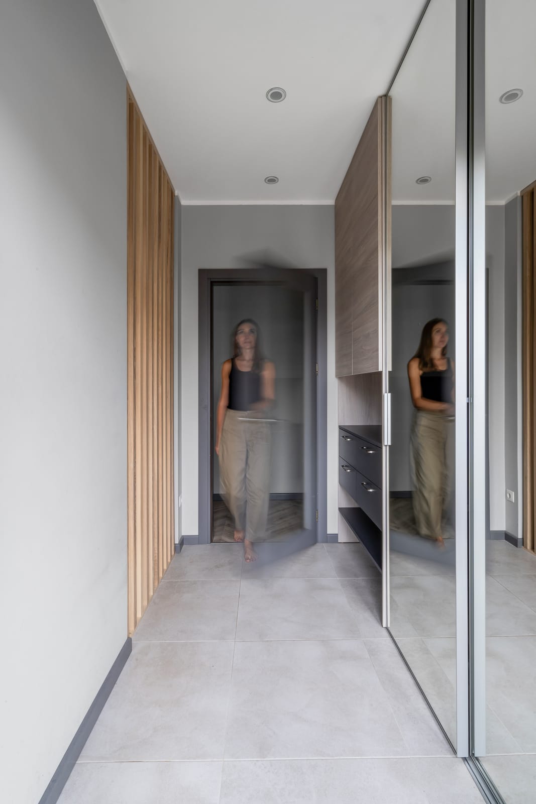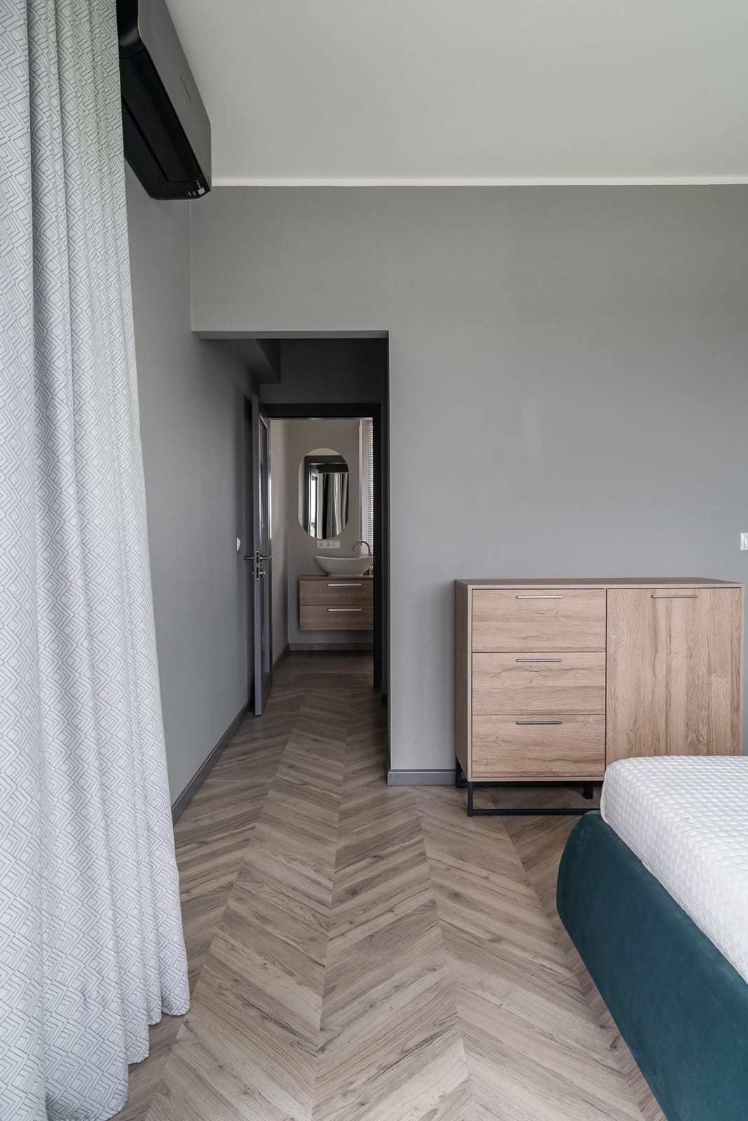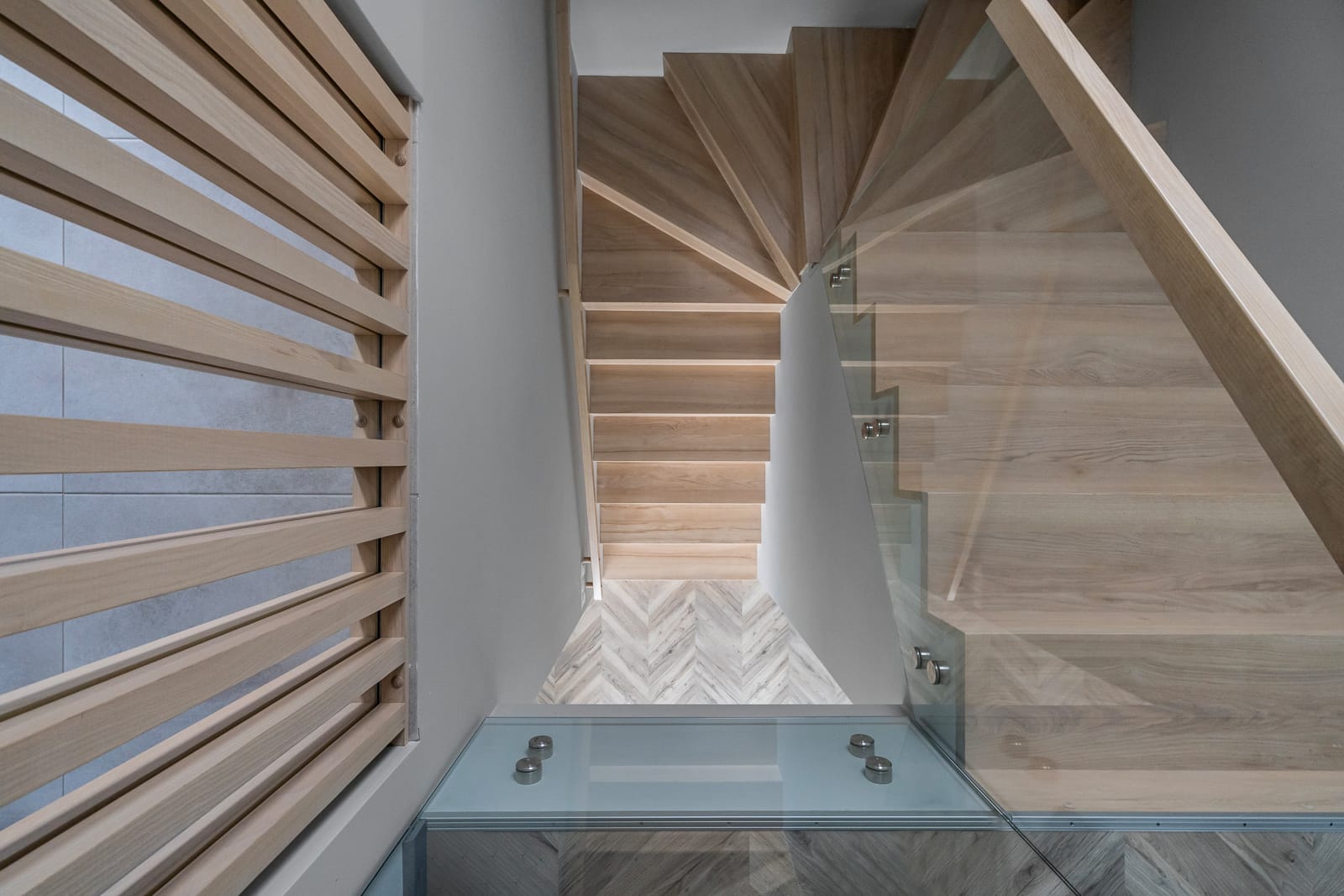 Medinės grindys, klotos eglute, interjerui suteikia vizualinio ritmo ir padeda apjungti skirtingas erdves į vientisą visumą. Spalviniai akcentai ir interjero charakteris kuriami per detales, tekstilę, apšvietimą ir baldus. Pagrindinės erdvės išlieka neutralios, lengvai pritaikomoms ir aktualioms laikui bėgant.