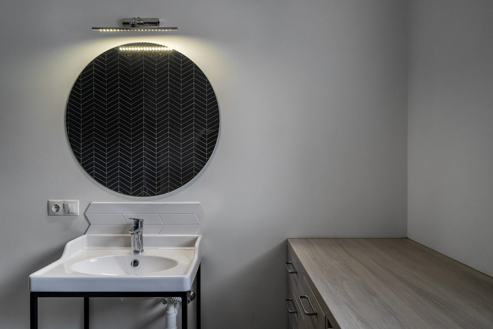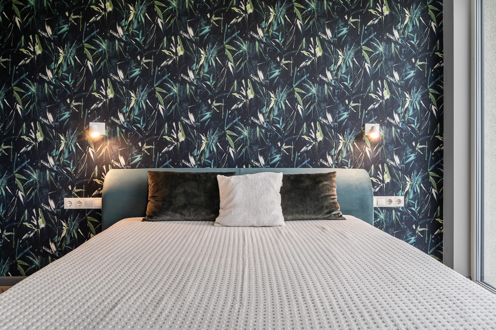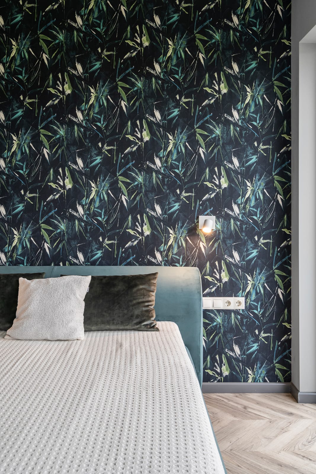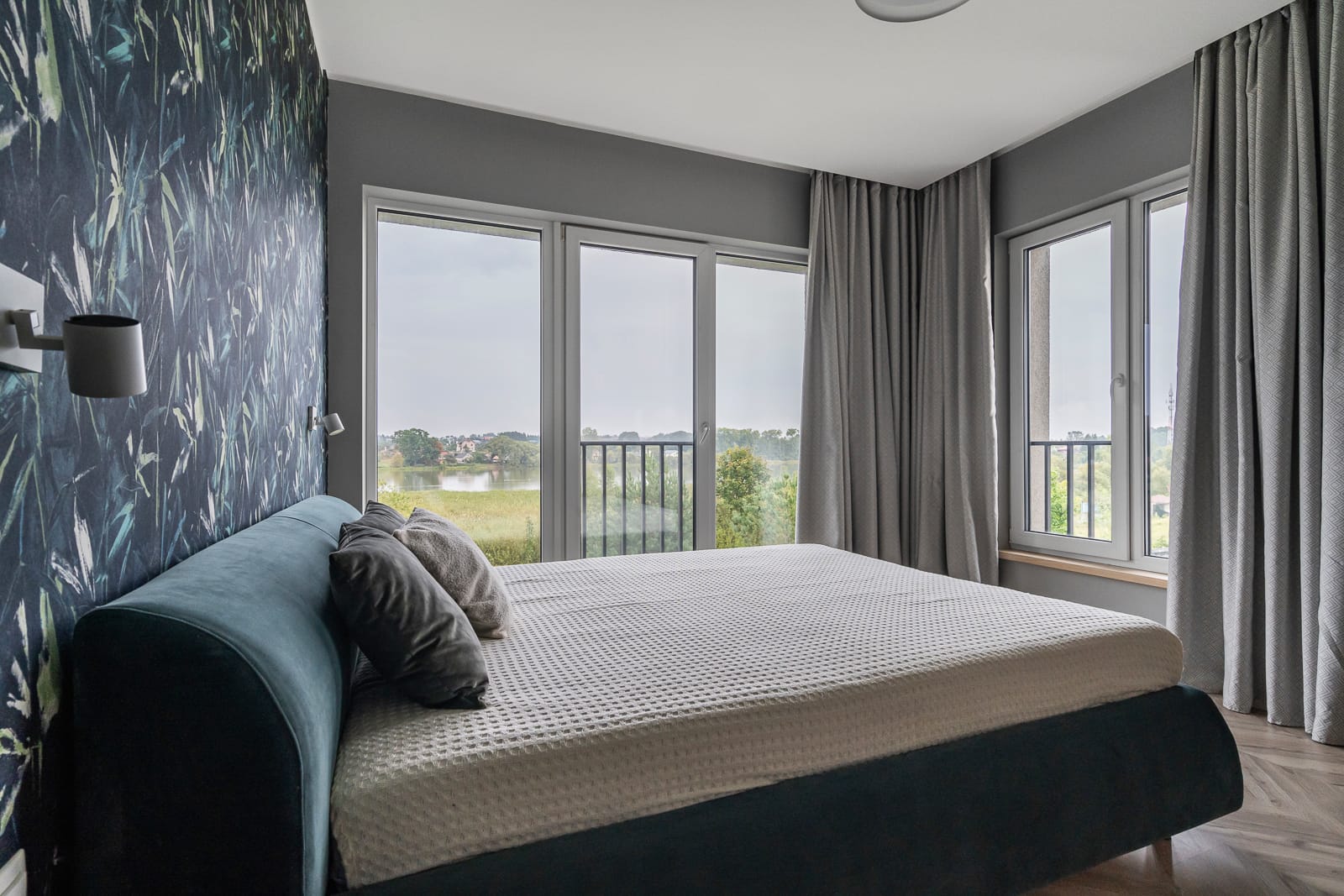 Medinės grindys, klotos eglute, interjerui suteikia vizualinio ritmo ir padeda apjungti skirtingas erdves į vientisą visumą. Spalviniai akcentai ir interjero charakteris kuriami per detales, tekstilę, apšvietimą ir baldus. Pagrindinės erdvės išlieka neutralios, lengvai pritaikomoms ir aktualioms laikui bėgant.