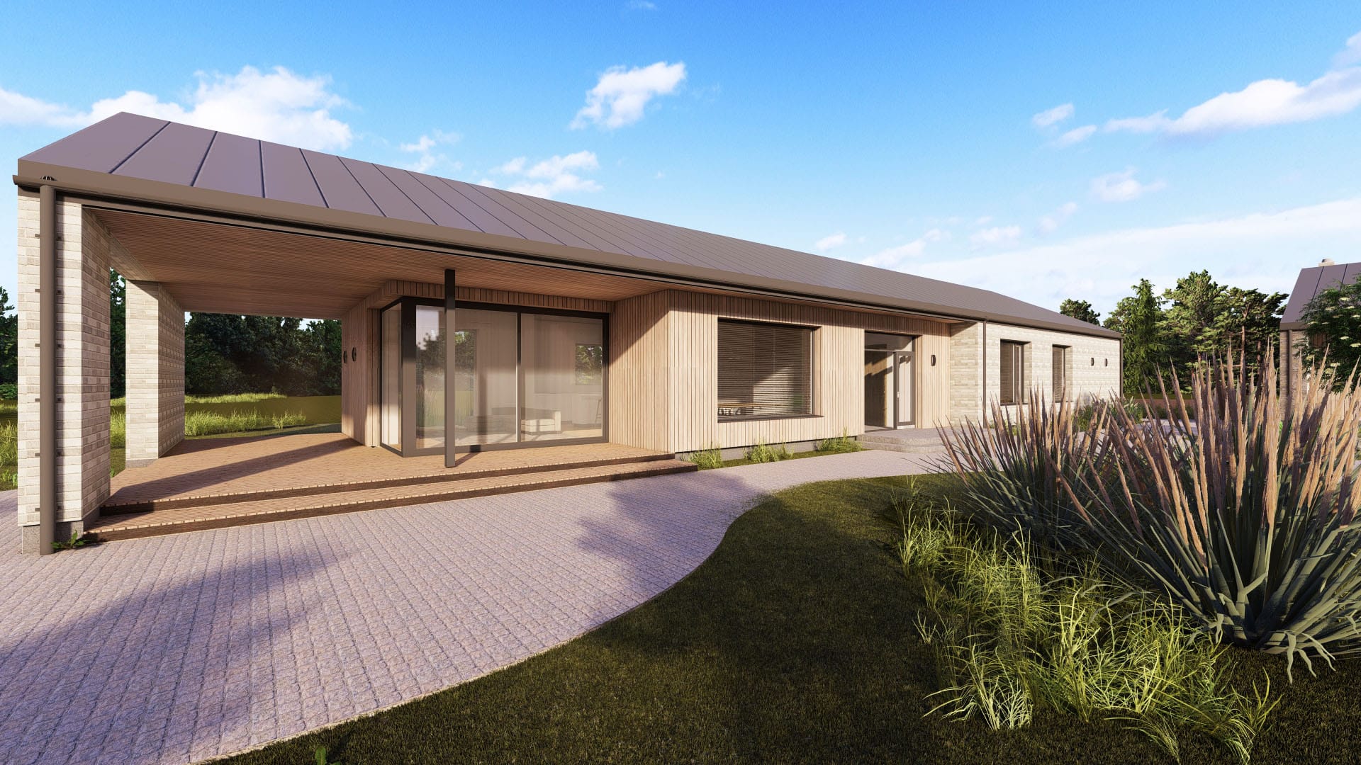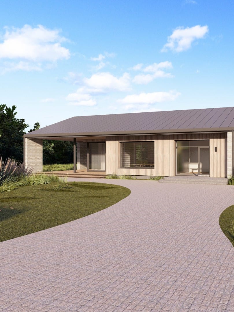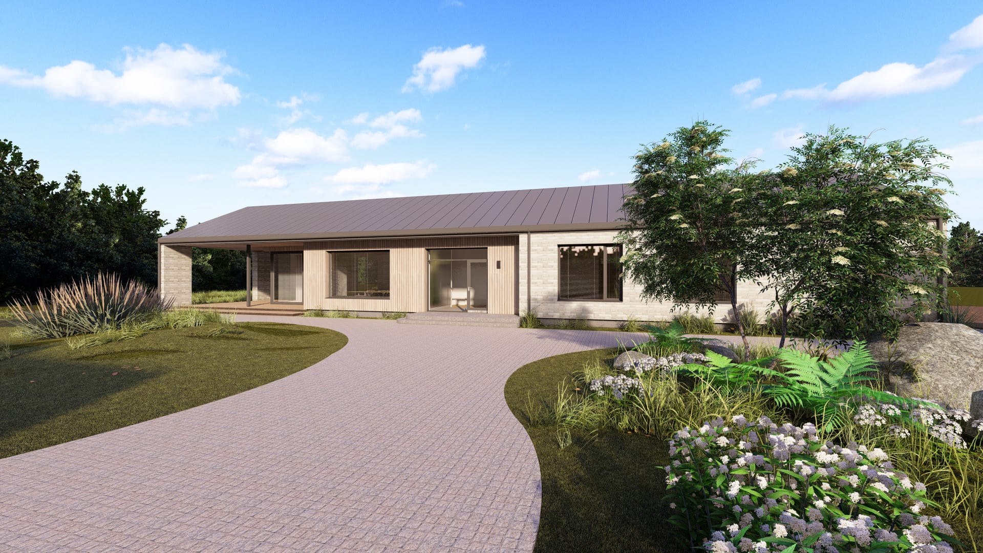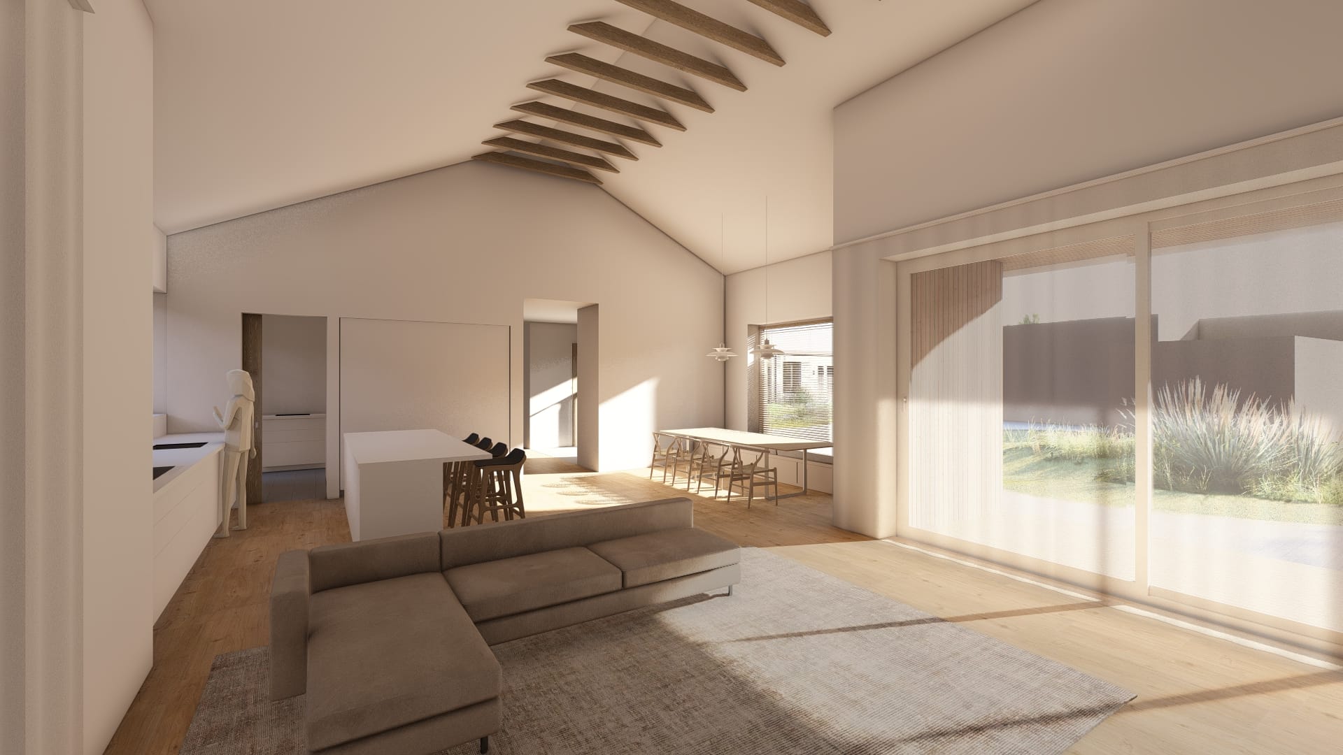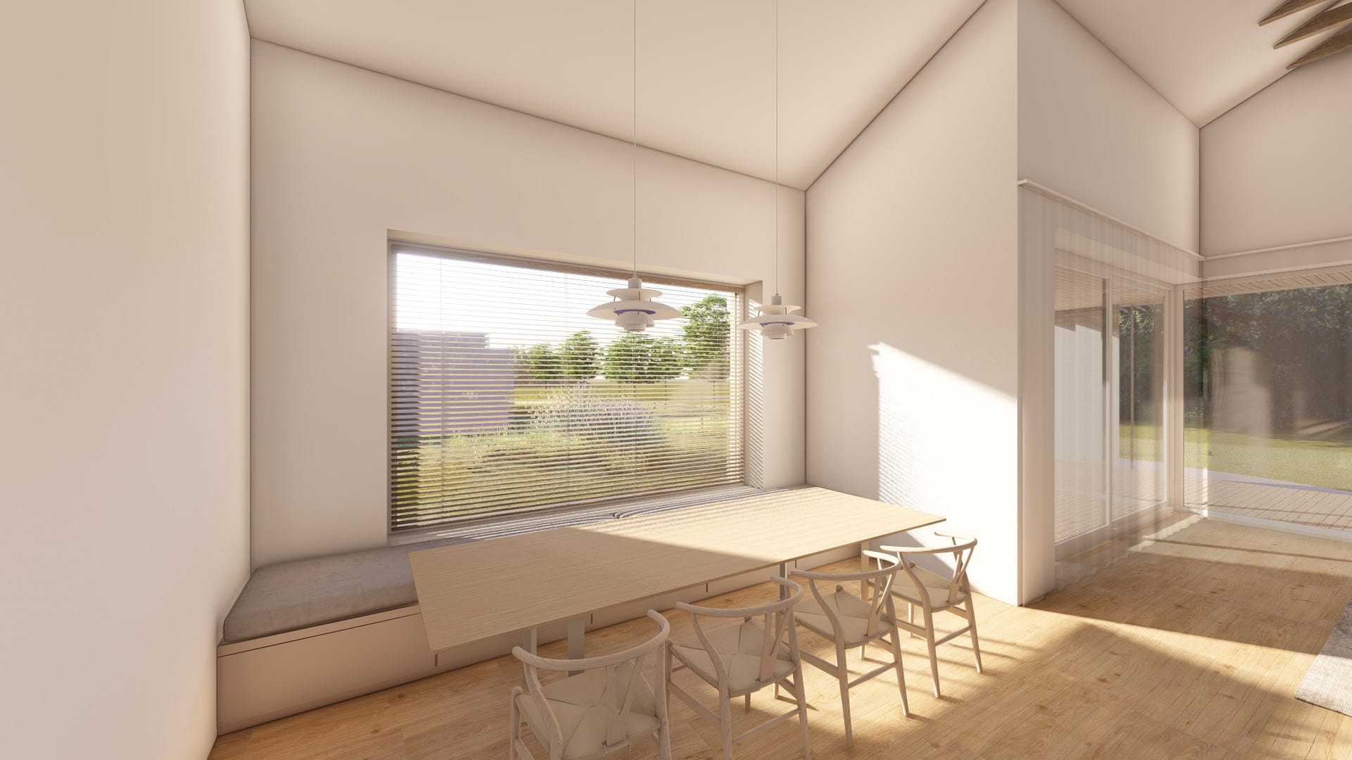 Suprojektuotas gyvenamasis namas šeimai ir atskiras daugiafunkcis ūkinis pastatas formuojant vientisą sodybinio tipo užstatymą. Abiejų statinių architektūrinė išraiška sąmoningai pasirinkta nuosaiki, stačiakampio tūriai su dvišlaičiais stogais, atliepiantys teritorijoje vyraujantį tradicinį sodybinį užstatymą.