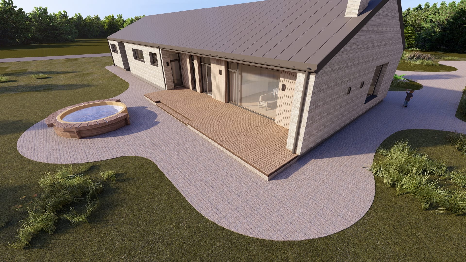 Pastatų tūrinė kompozicija išgryninta pagal funkciją. Kiekvienas statinys aiškiai atliepia savo paskirtį, o tarpusavio santykis formuoja logišką ir aiškiai skaitomą sklypo struktūrą. Gyvenamasis namas orientuotas į patogią šeimos kasdienybę. Daugiafunkcis ūkinis pastatas suprojektuotas taip, kad galėtų lanksčiai prisitaikyti prie įvairių naudojimo scenarijų.