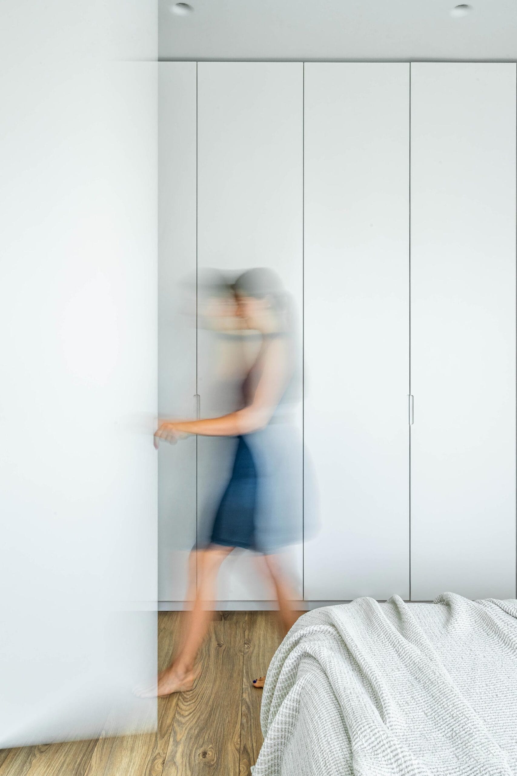 Miegamasis projektuotas šviesių, ramių tonų, kuriant poilsio ir atokvėpio erdvę. Vonios kambaryje pasirinkta ryškesnė tekstūrinė išraiška, masyvus, didelio formato praustuvas tampa pagrindiniu akcentu ir sustiprina erdvės charakterį.