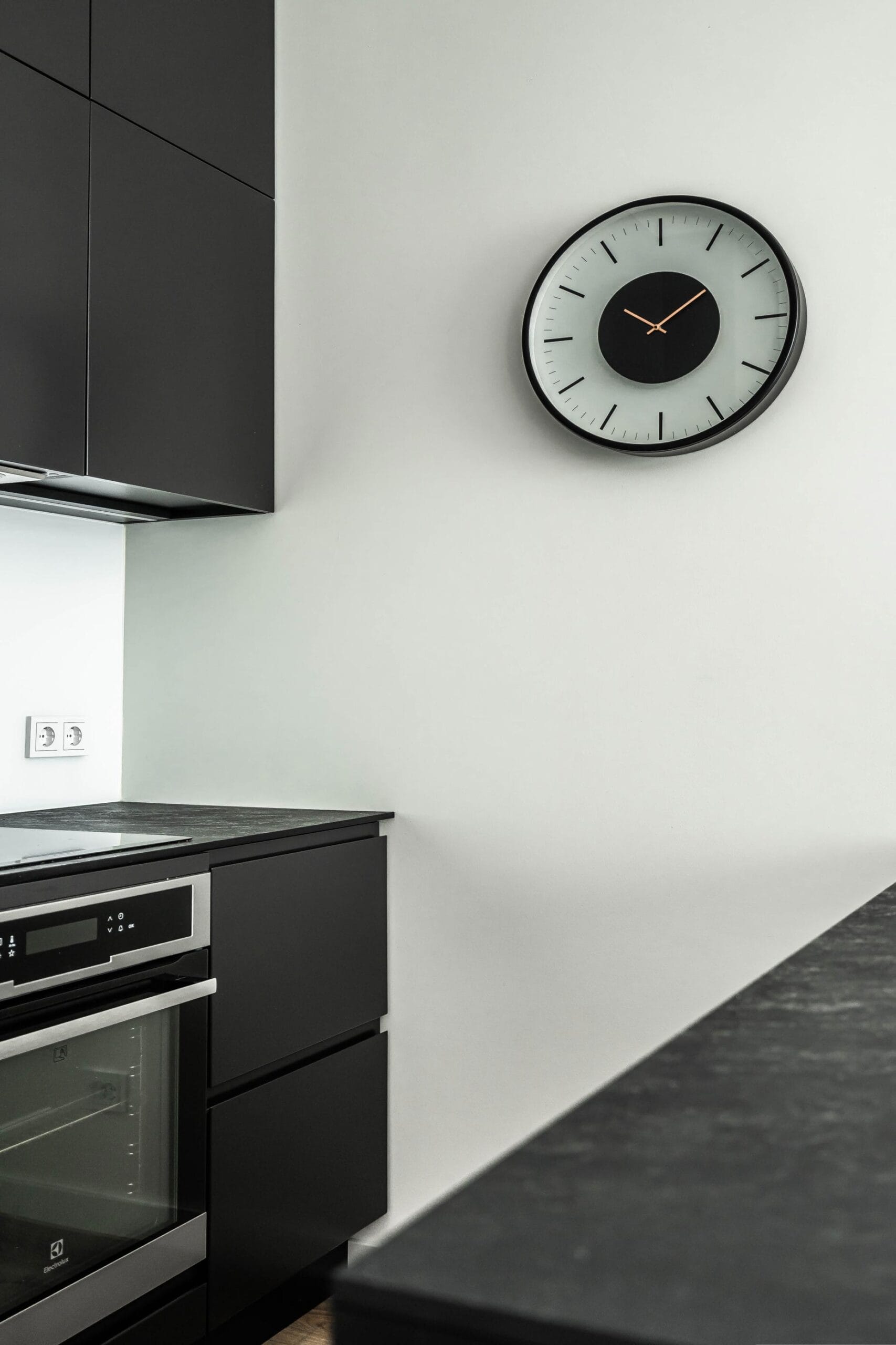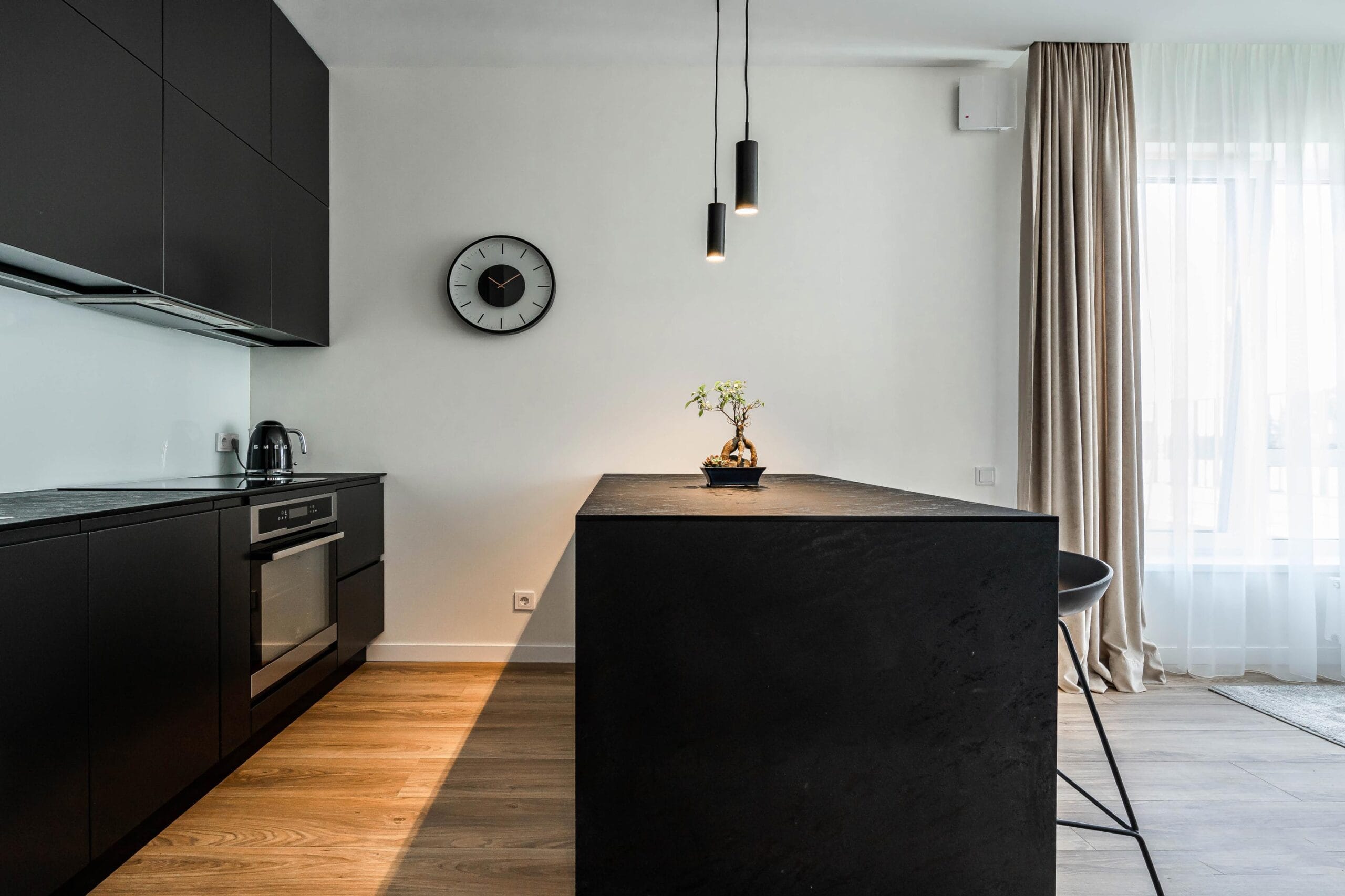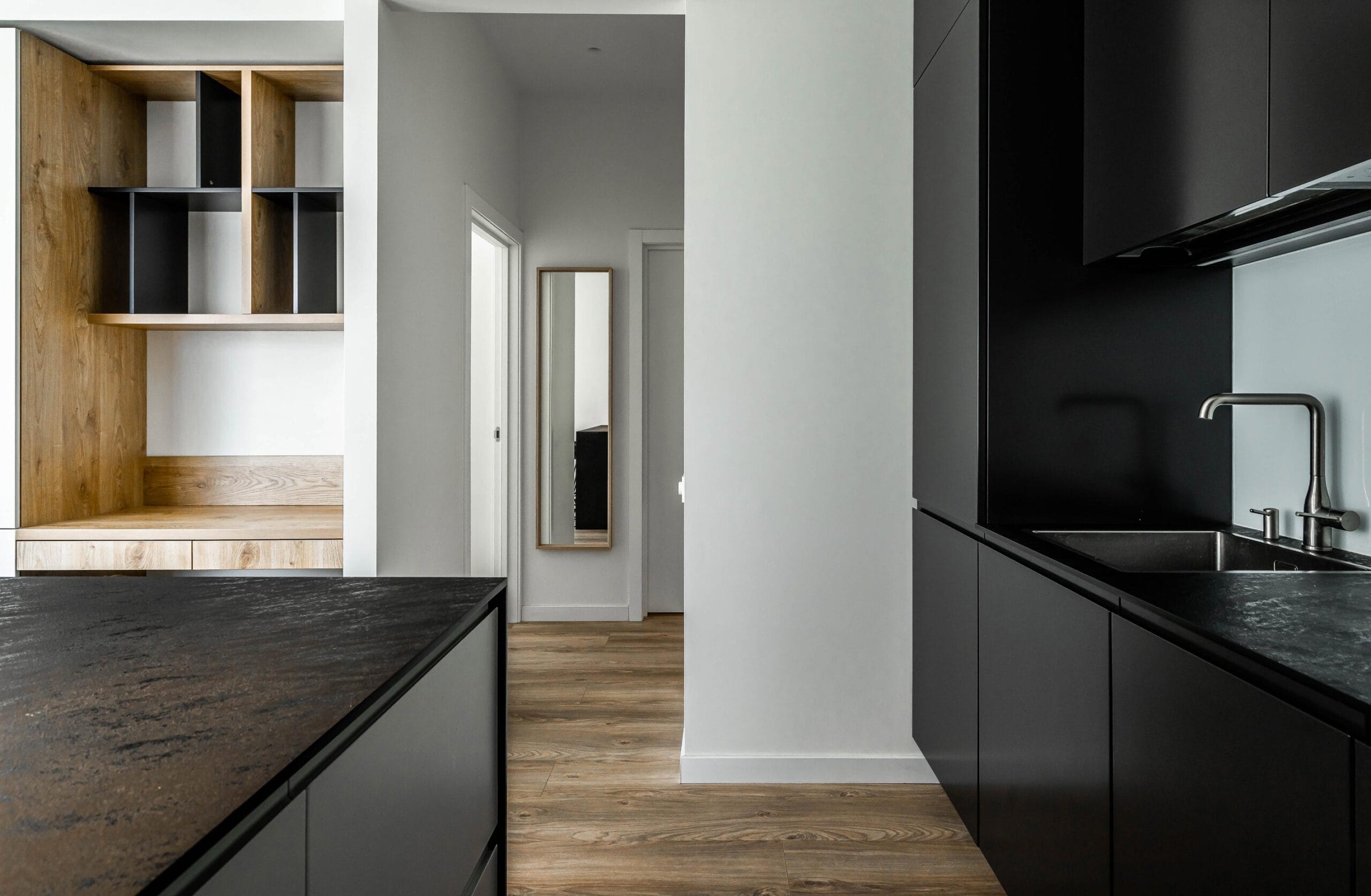 Virtuvės tūris formuojamas juodos spalvos akcentu, kuris nedidelėje erdvėje suteikia gylio ir vizualinio stabilumo. Juodą spalvą subalansuoja natūralaus medžio fasadai, naudojami baldų apdailoje, suteikiantys interjerui šilumos ir minkštumo.