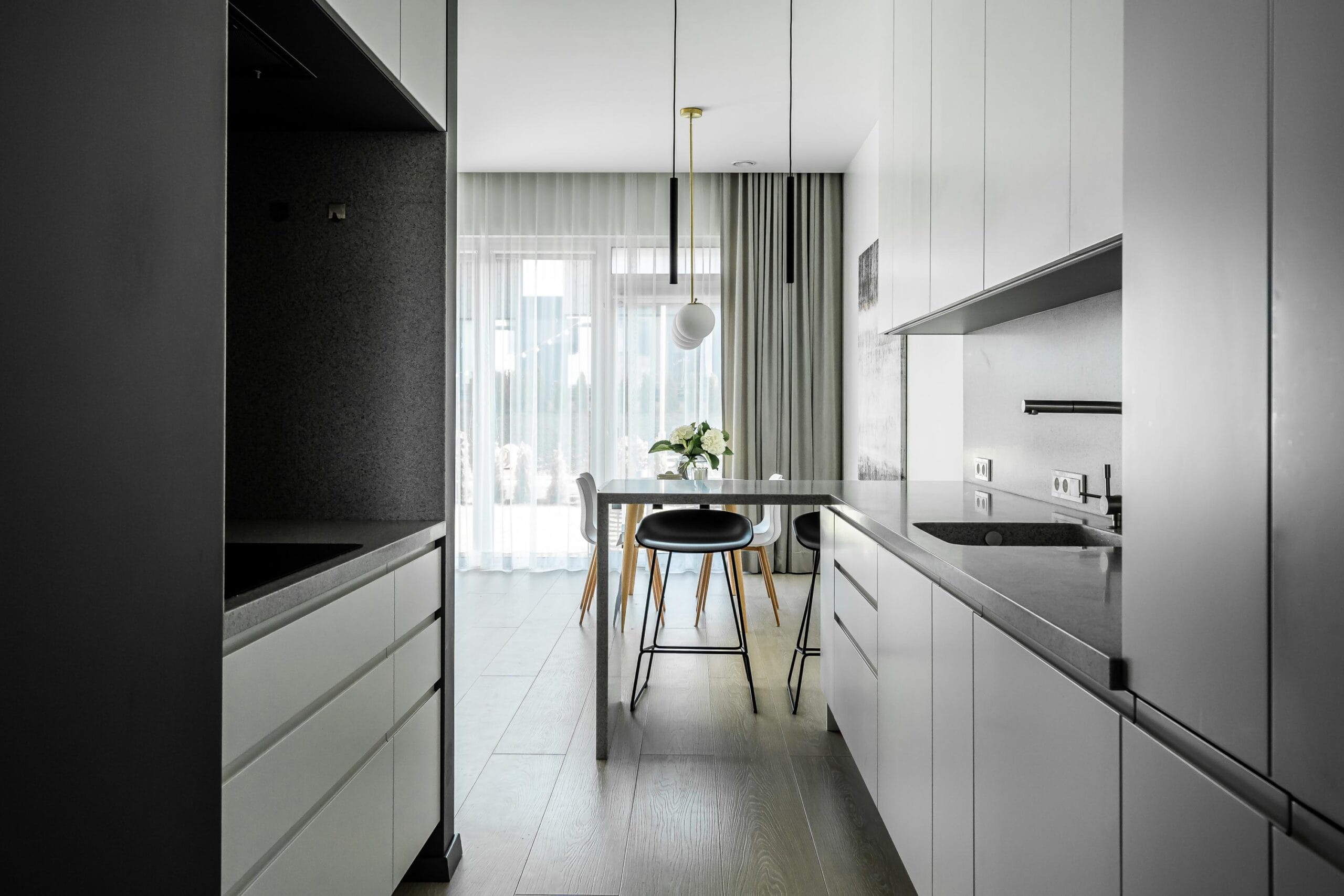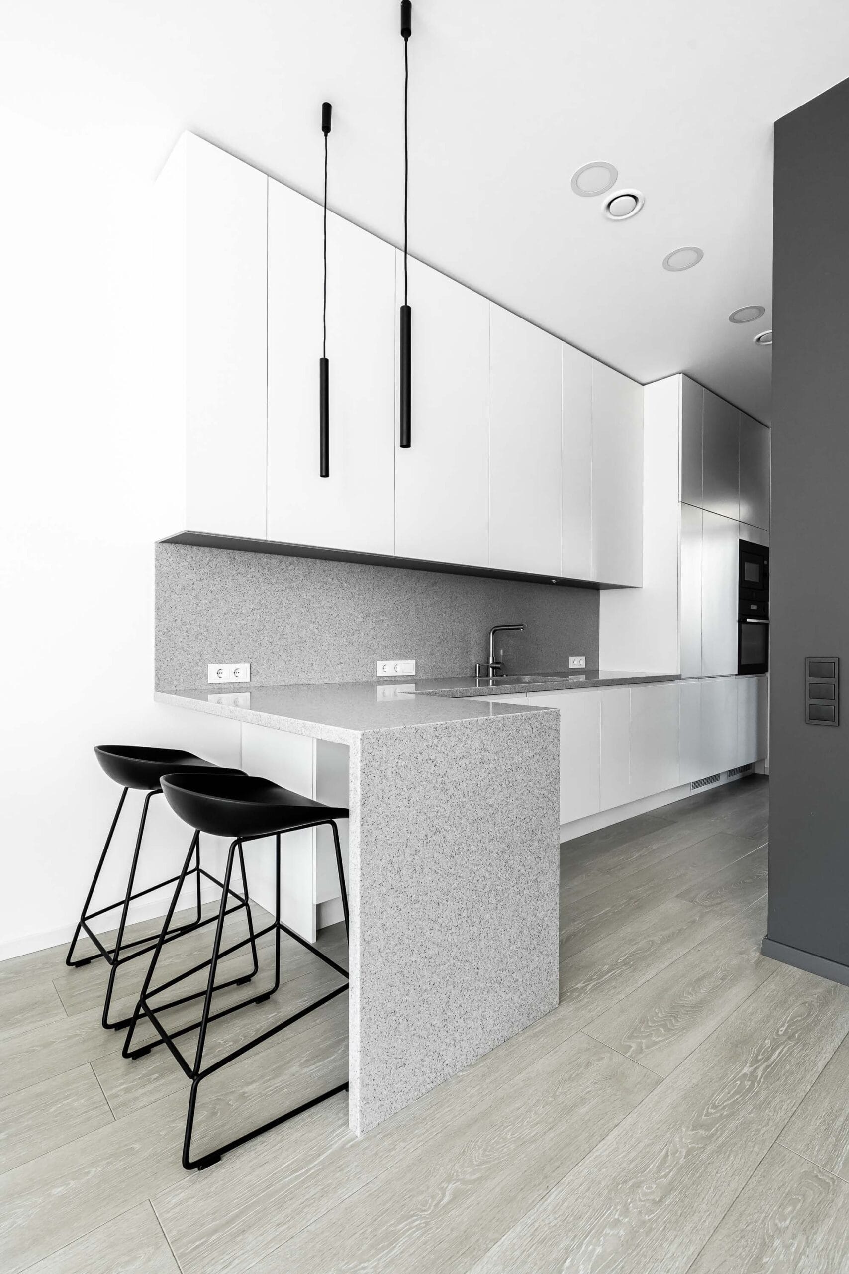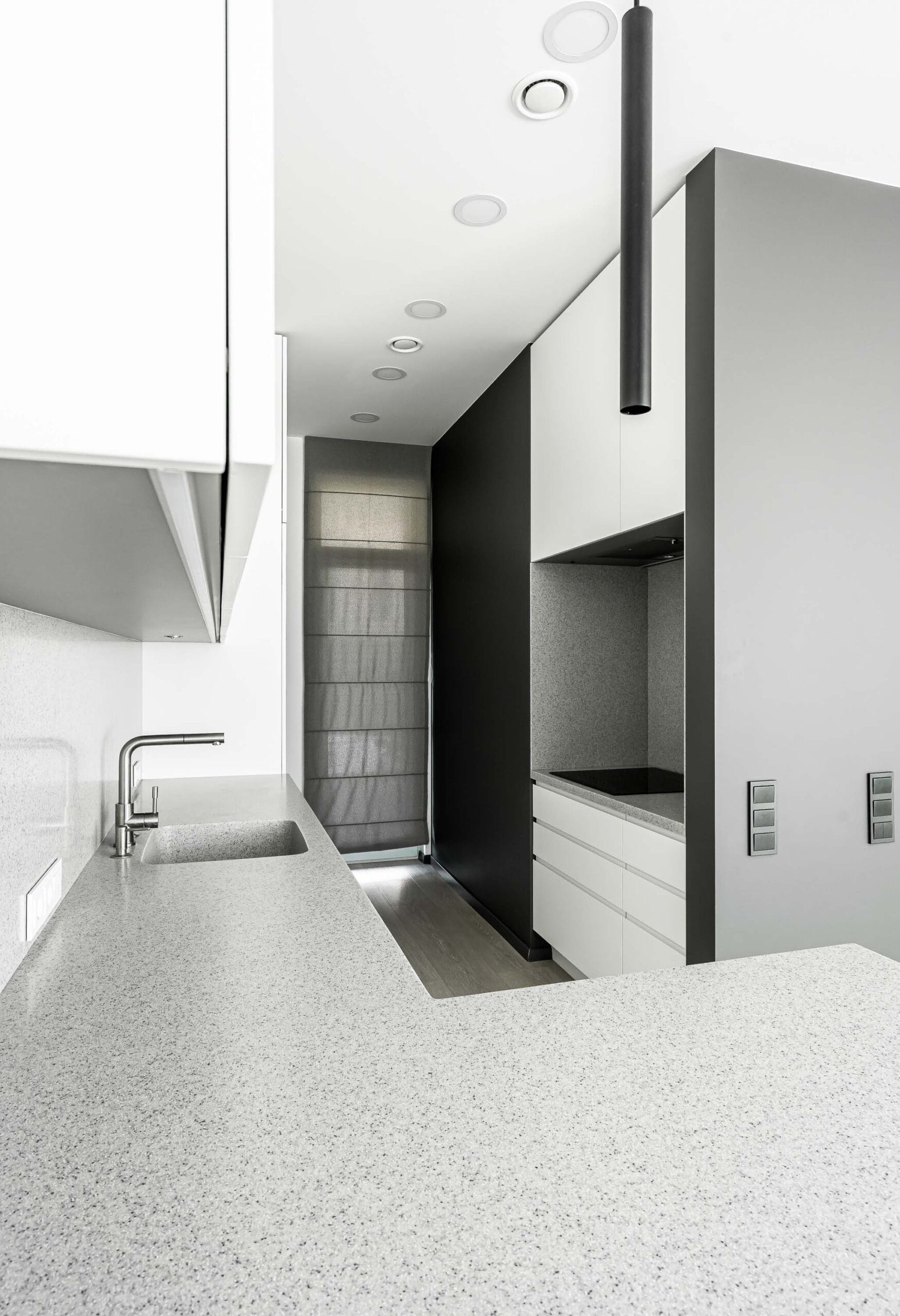 Didelis dėmesys skirtas funkcionaliam išplanavimui ir virtuvės zonai. Visi sprendiniai apgalvoti taip, kad kasdieniai veiksmai būtų patogūs, o erdvė veiktų sklandžiai skirtinguose naudojimo scenarijuose. Virtuvės baldų fasadams naudotas dažytas MDF su frezuotomis rankenėlėmis. Stalviršis bei sienutė tarp stalviršio ir pakabinamų spintelių suprojektuoti iš lieto akmens, ilgaamžės, praktiškos medžiagos.