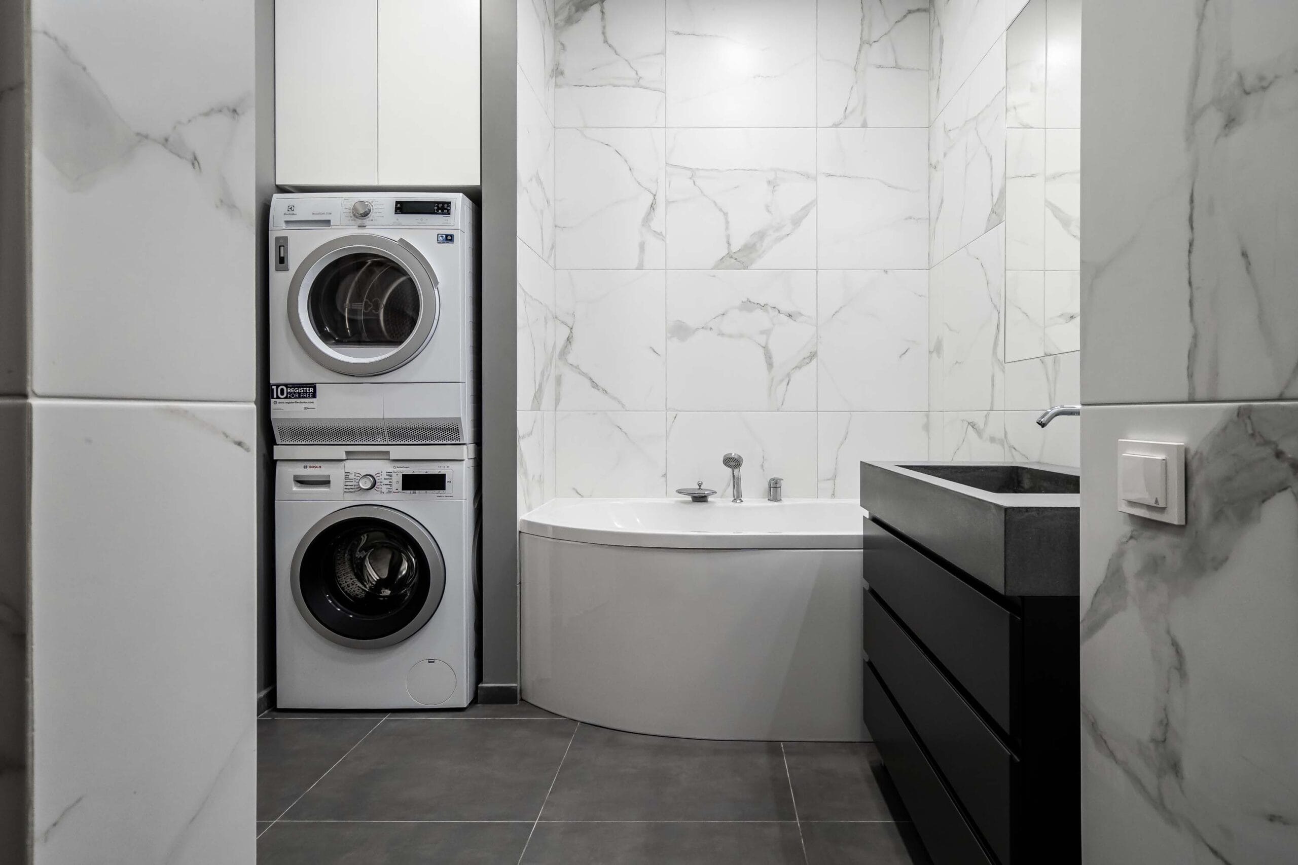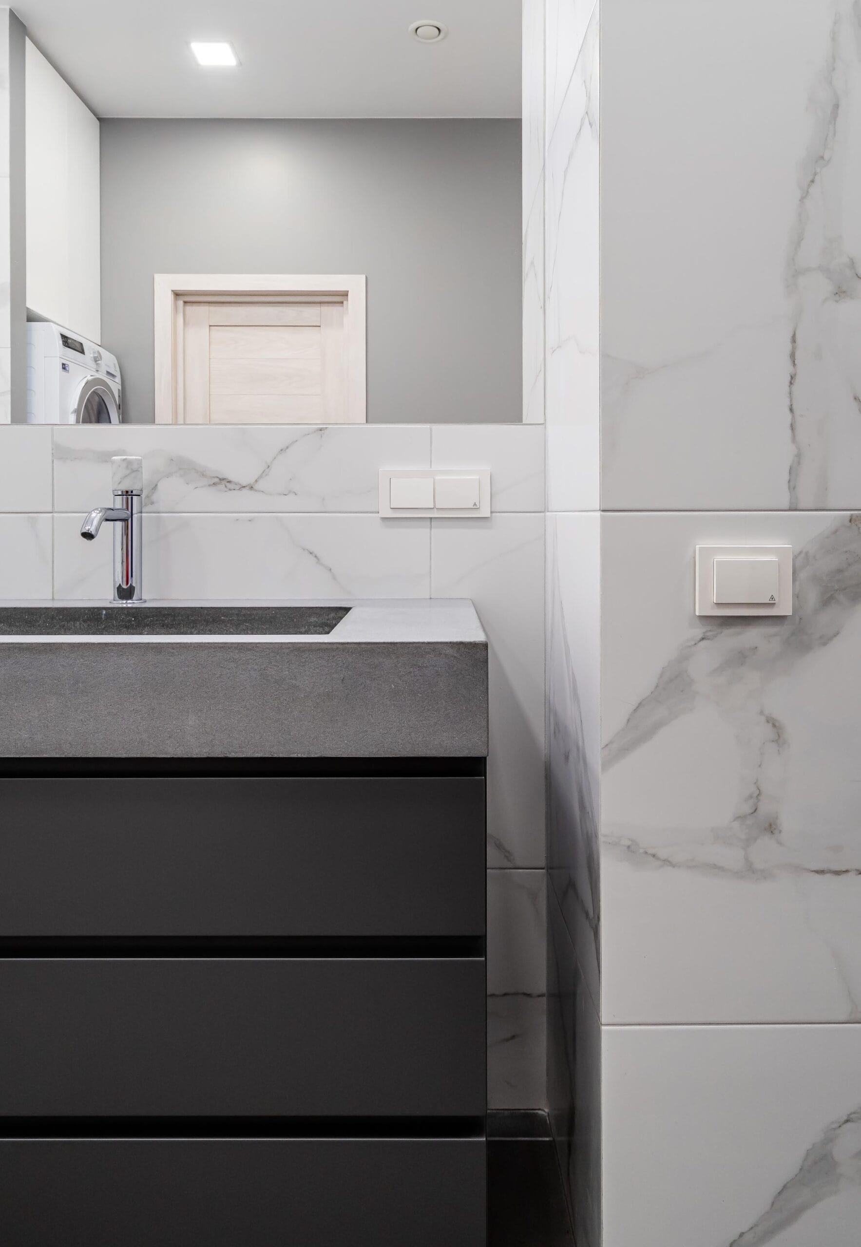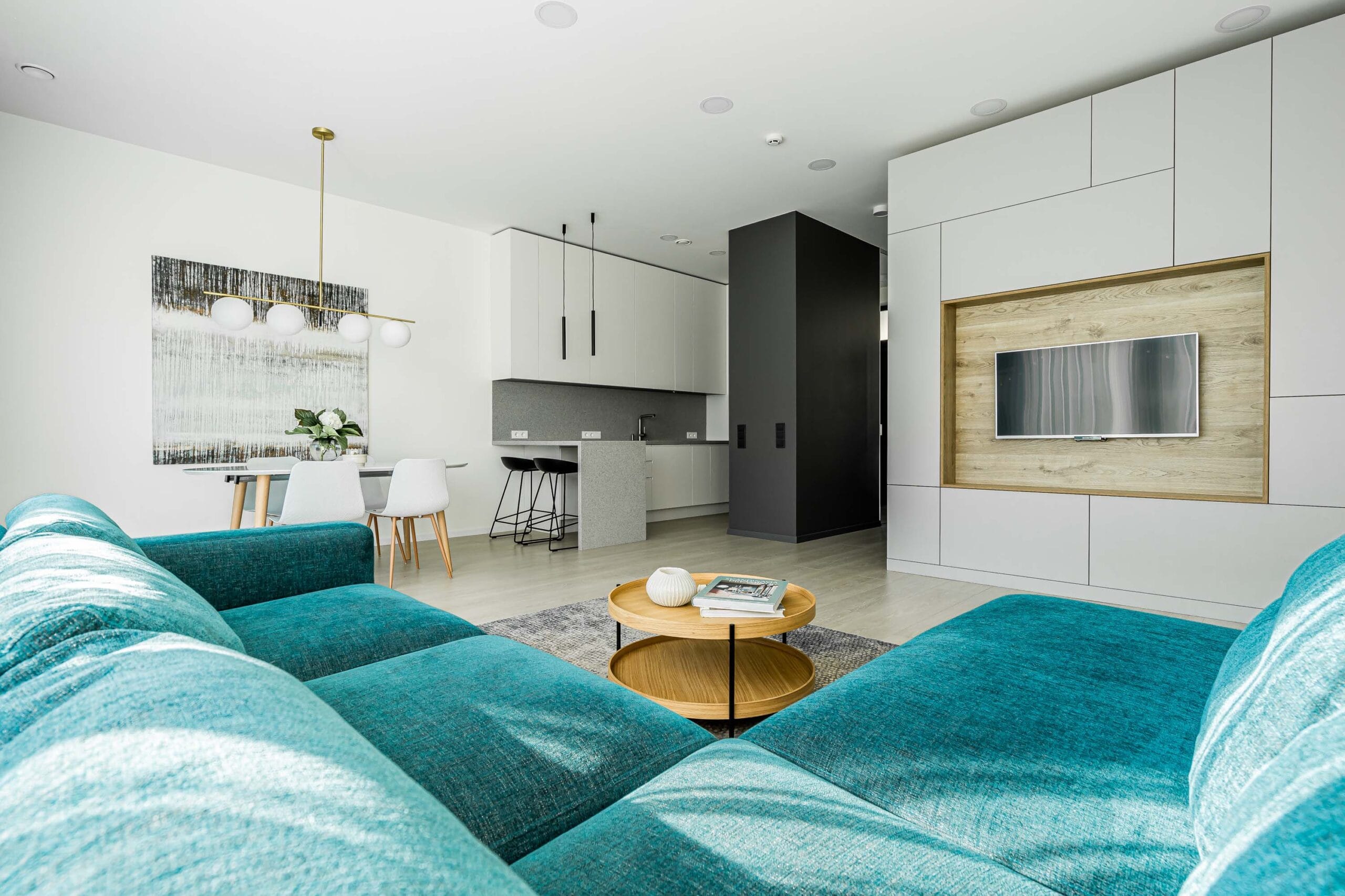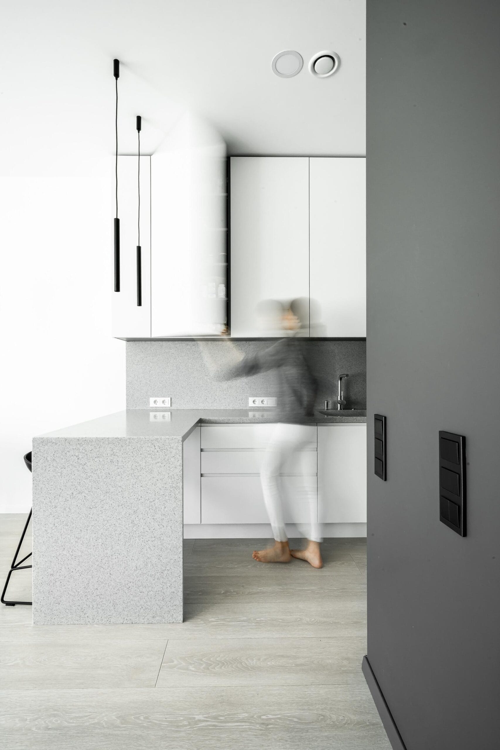 Didelis dėmesys skirtas funkcionaliam išplanavimui ir virtuvės zonai. Visi sprendiniai apgalvoti taip, kad kasdieniai veiksmai būtų patogūs, o erdvė veiktų sklandžiai skirtinguose naudojimo scenarijuose. Virtuvės baldų fasadams naudotas dažytas MDF su frezuotomis rankenėlėmis. Stalviršis bei sienutė tarp stalviršio ir pakabinamų spintelių suprojektuoti iš lieto akmens, ilgaamžės, praktiškos medžiagos.