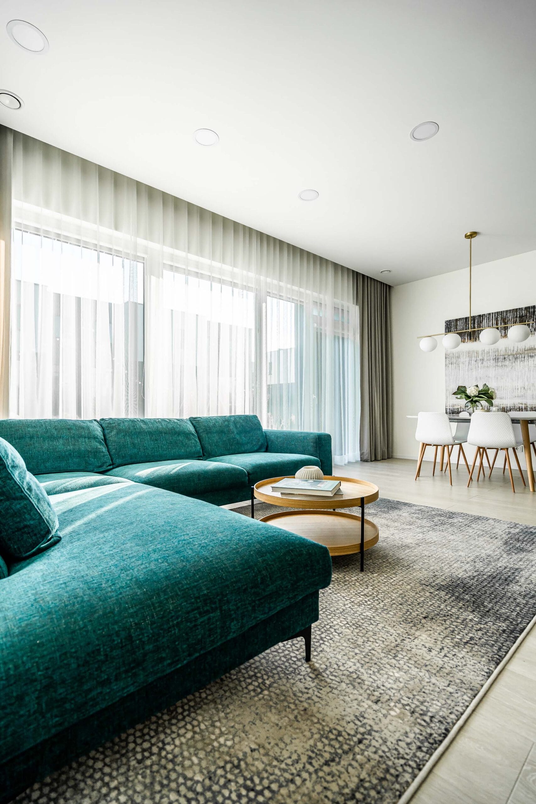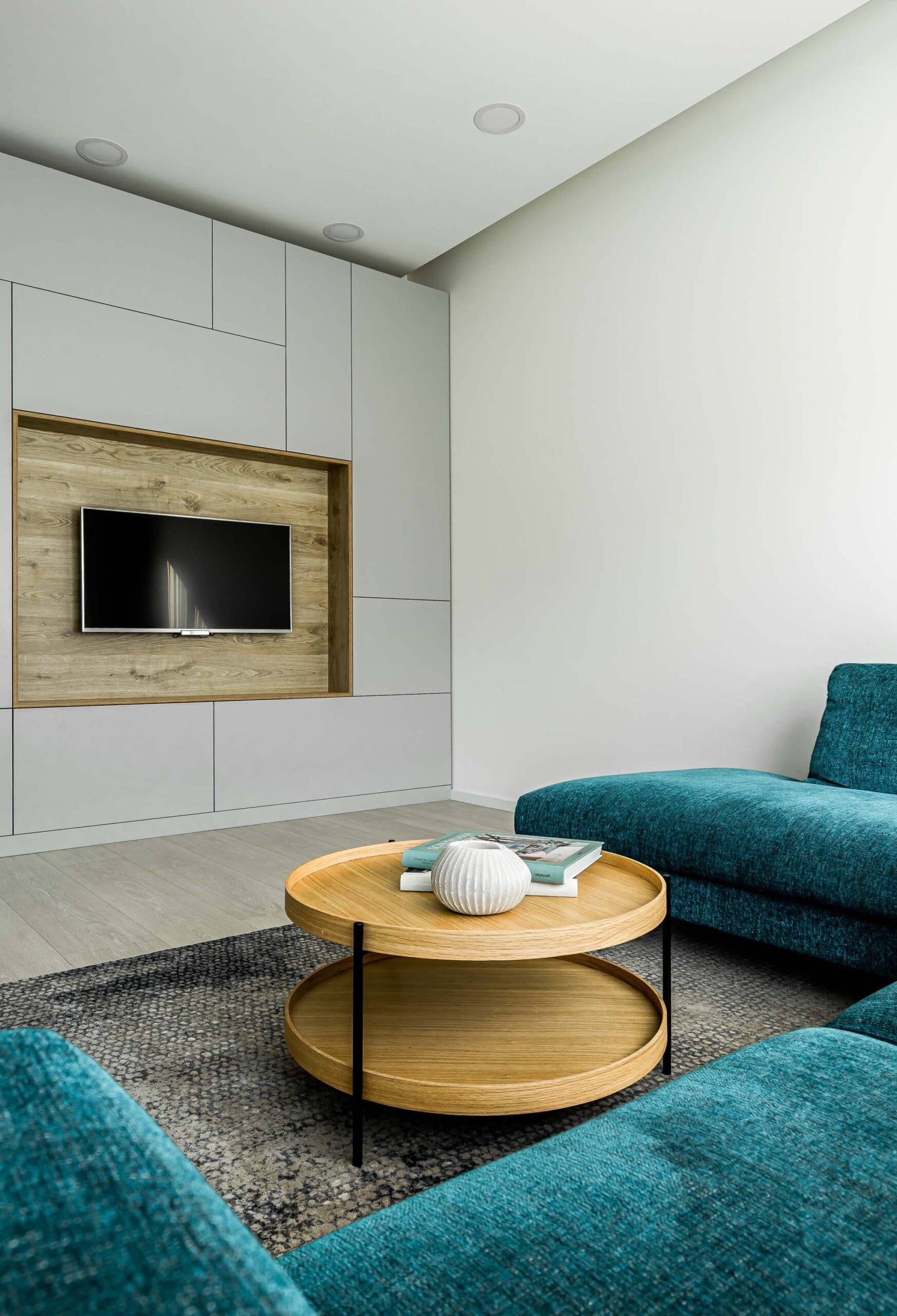 Interjero sprendiniai orientuoti į jaunos šeimos poreikius išlaikanti estetinę vertę laikui bėgant.