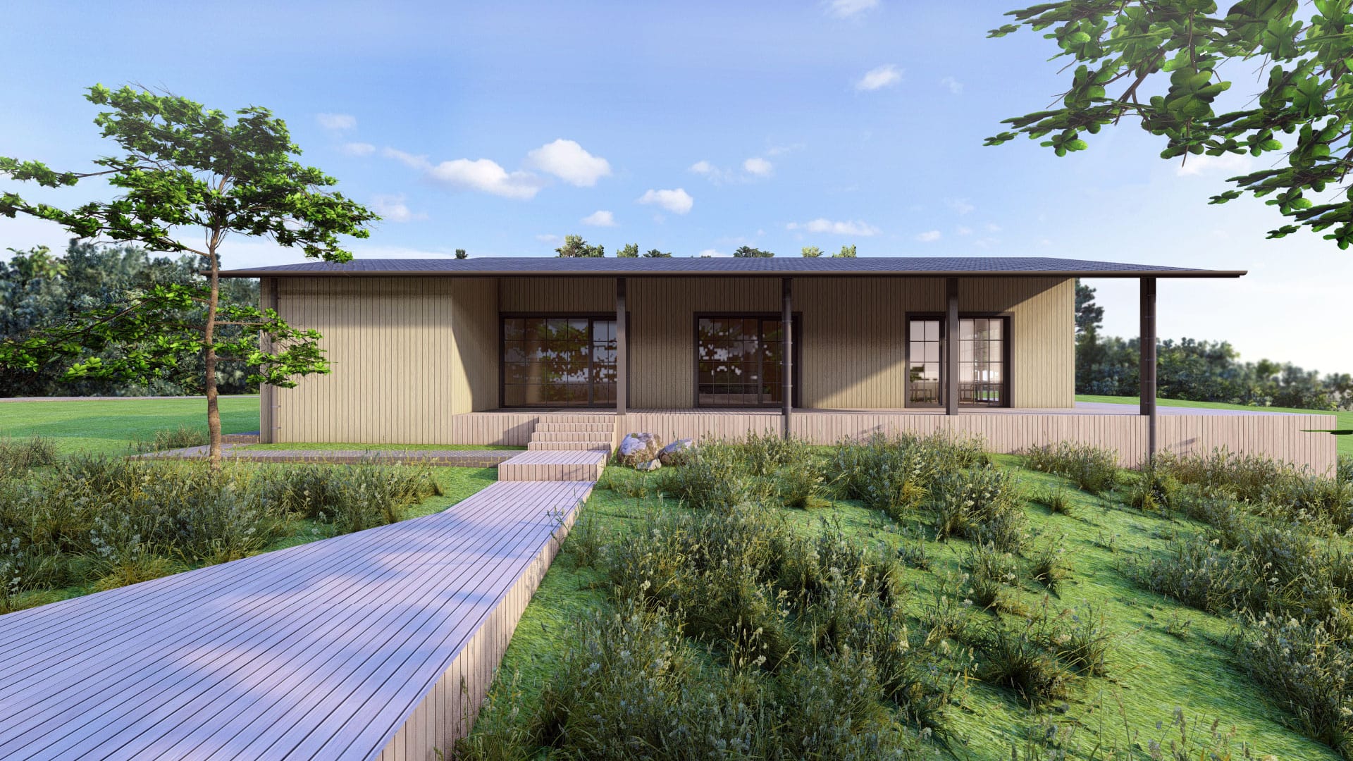 Medžio fasadas pasirinktas kaip ilgaamžė ir kontekstuali apdailos medžiaga, harmoningai deranti su miško aplinka. Didelė terasa orientuota ežero kryptimi, užtikrinant vizualinį ryšį su kraštovaizdžiu ir galimybę visavertiškai naudotis lauko erdvėmis.