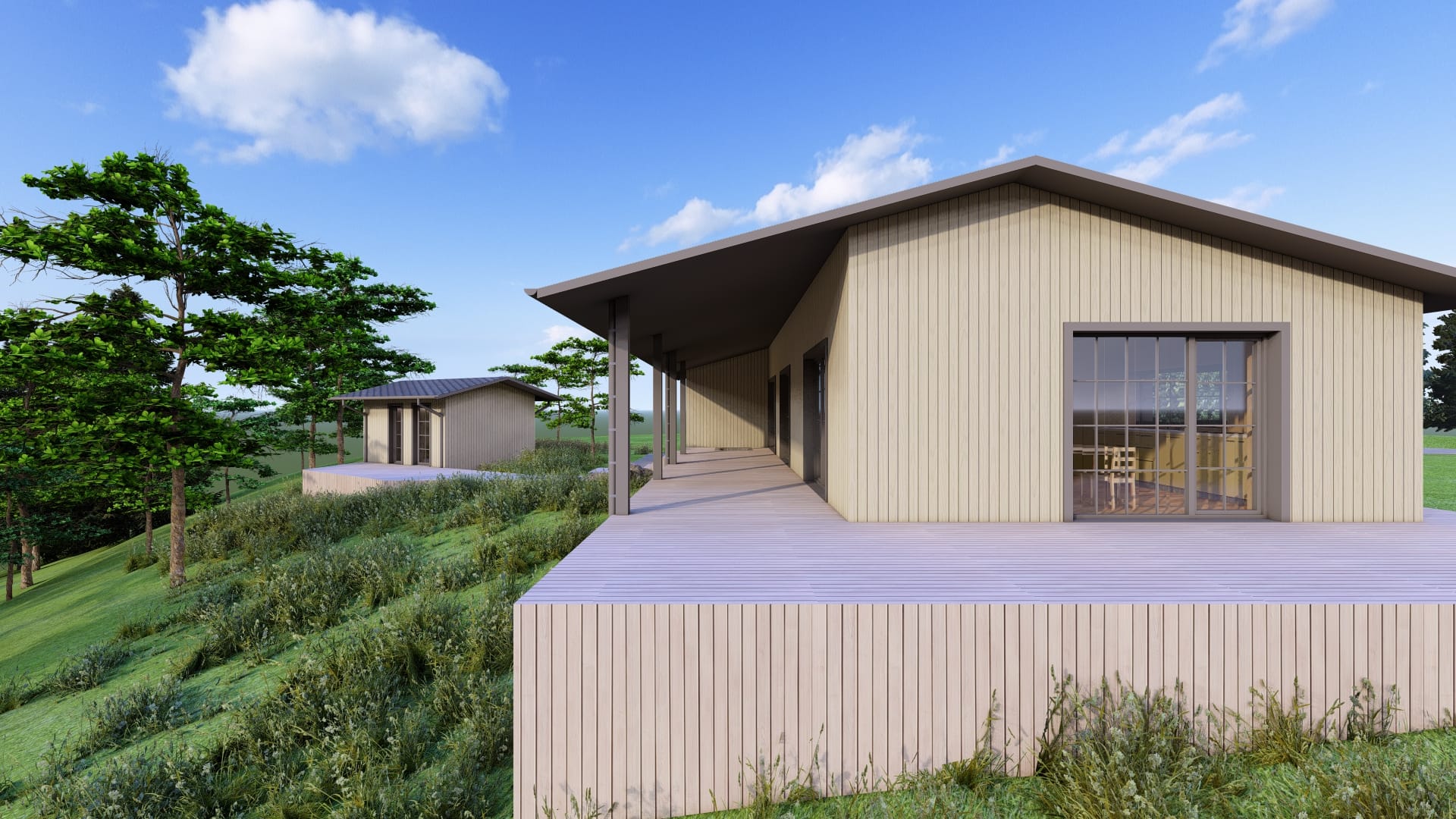 Vieno aukšto poilsio namo projektas gamtinėje aplinkoje sukurtas sklype su dideliu nuolydžiu, miško apsuptyje, šlaite prie ežero. Architektūriniai sprendiniai formuoti reaguojant į  reljefą ir esamą medžių masyvą, siekiant maksimaliai išsaugoti natūralų kraštovaizdį ir sklypo charakterį.
